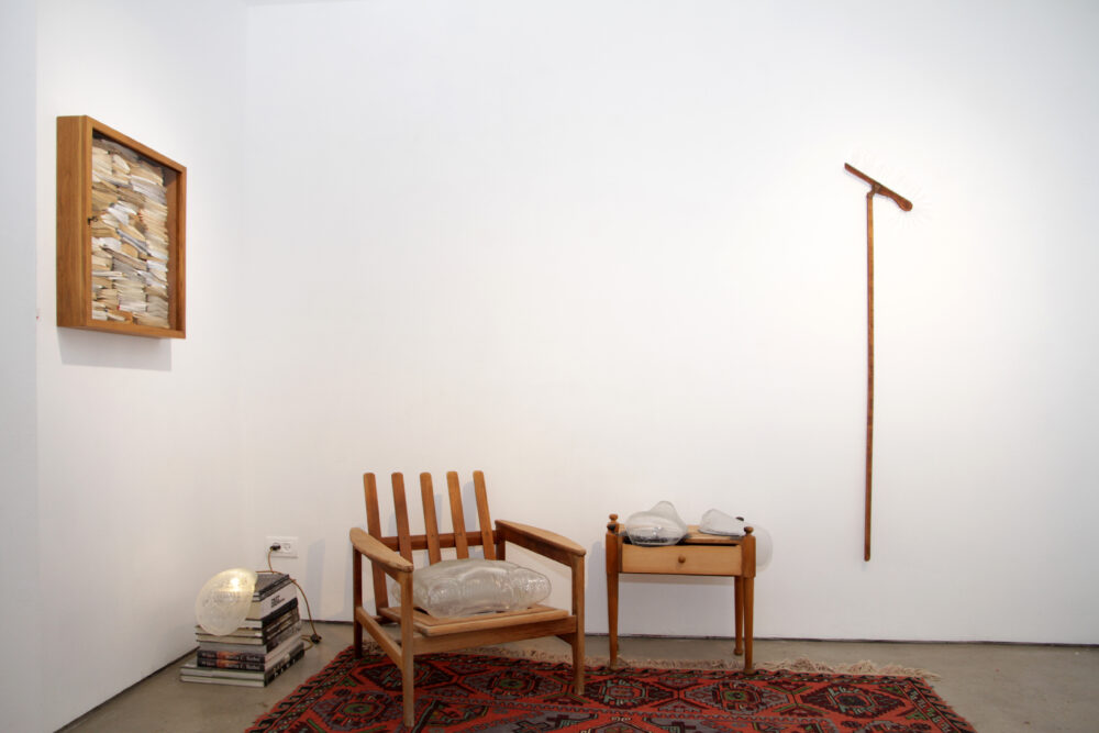 Elia Bloch’s works are installed as a reading corner that invites the viewer to an intimate, warm experience, where light, book, and domestic object are charged with quiet, memory, and a sense of fragility.